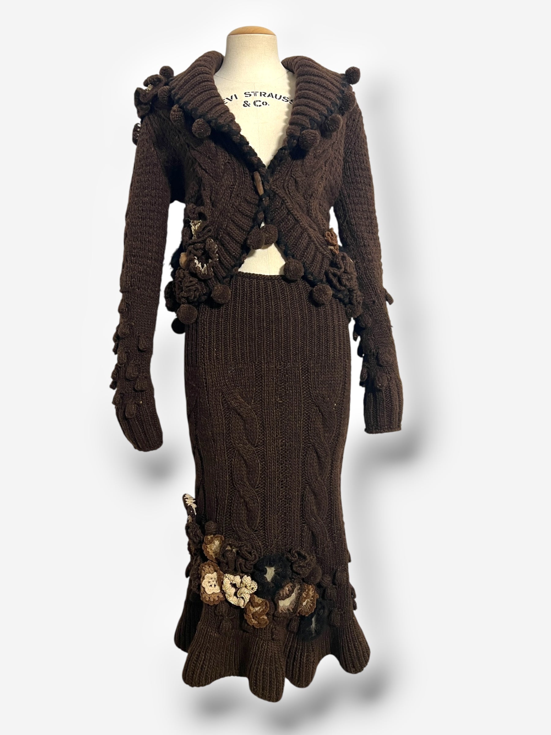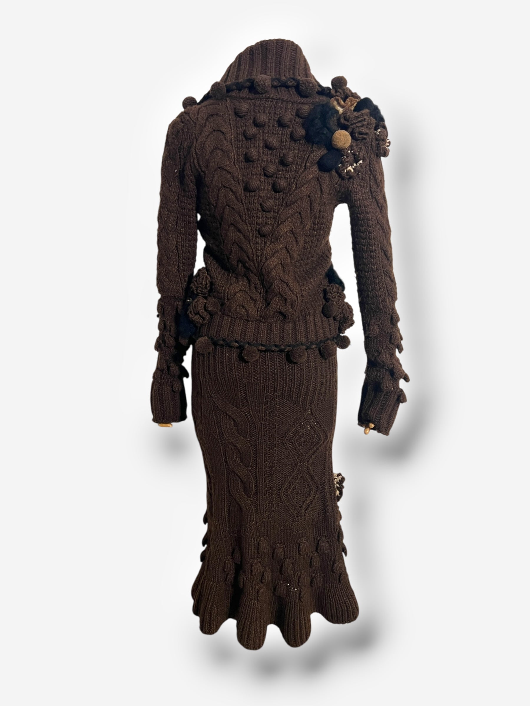 From Alexander McQueen’s Fall/Winter 2005 collection, this rare knit ensemble exemplifies the designer’s masterful blend of heritage craftsmanship and avant-garde drama. The look comprises a richly textured alpaca and wool cardigan with appliquéd crochet flowers, pom-pom trim, and sculptural cable knit panels, paired with a matching skirt that continues the artisanal detailing. The cardigan features a striking keyhole neckline framed by voluminous knitwork and cinches at the waist with a tonal belt, while the skirt falls with hand-applied embellishments at the hem. Together, the pieces channel McQueen’s romantic narrative approach to design, offering both wearable warmth and runway-level artistry.