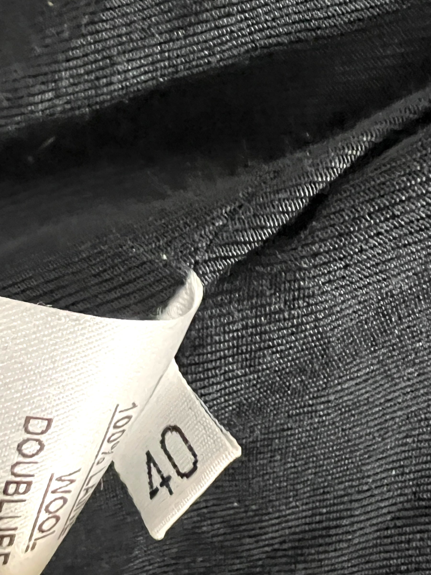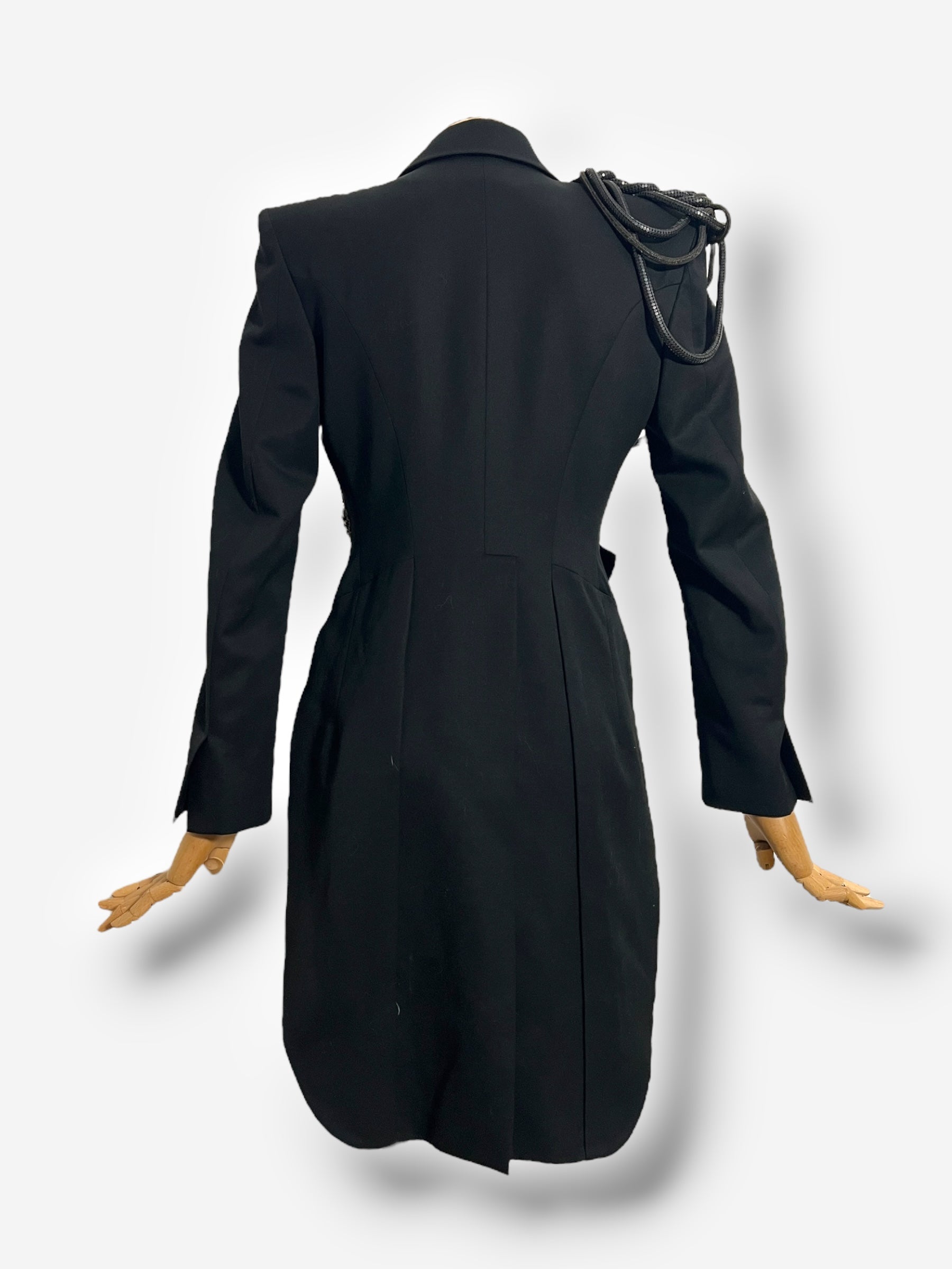 From Balmain’s iconic Spring/Summer 2010 collection under Christophe Decarnin, this rare black wool tailcoat epitomises the sharp, military-inspired aesthetic that defined the house during this era. The tailored silhouette features strong, structured shoulders and a cropped front with extended tails at the back. A dramatic chain epaulette with draped aiguillettes cascades from the right shoulder, while the lapels and front are decorated with an array of military-style medals, passementerie, and embellishments. Several of the brooches and pins were customised by the original owner, enhancing the one-of-a-kind character of the jacket.