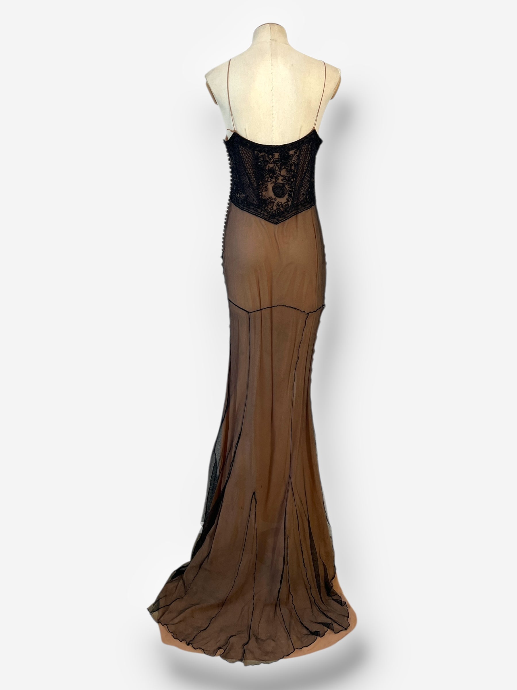 Long gowns like these barely make the resell market. Especially with a trail like this one. Perfect for a stand out look, and the lace detail isn’t actually lace, It’s completely made out of hunderds of small beads. The exact same dress was actually used in that years Dior parfume campaign, so you know the brand was very fond of this look.