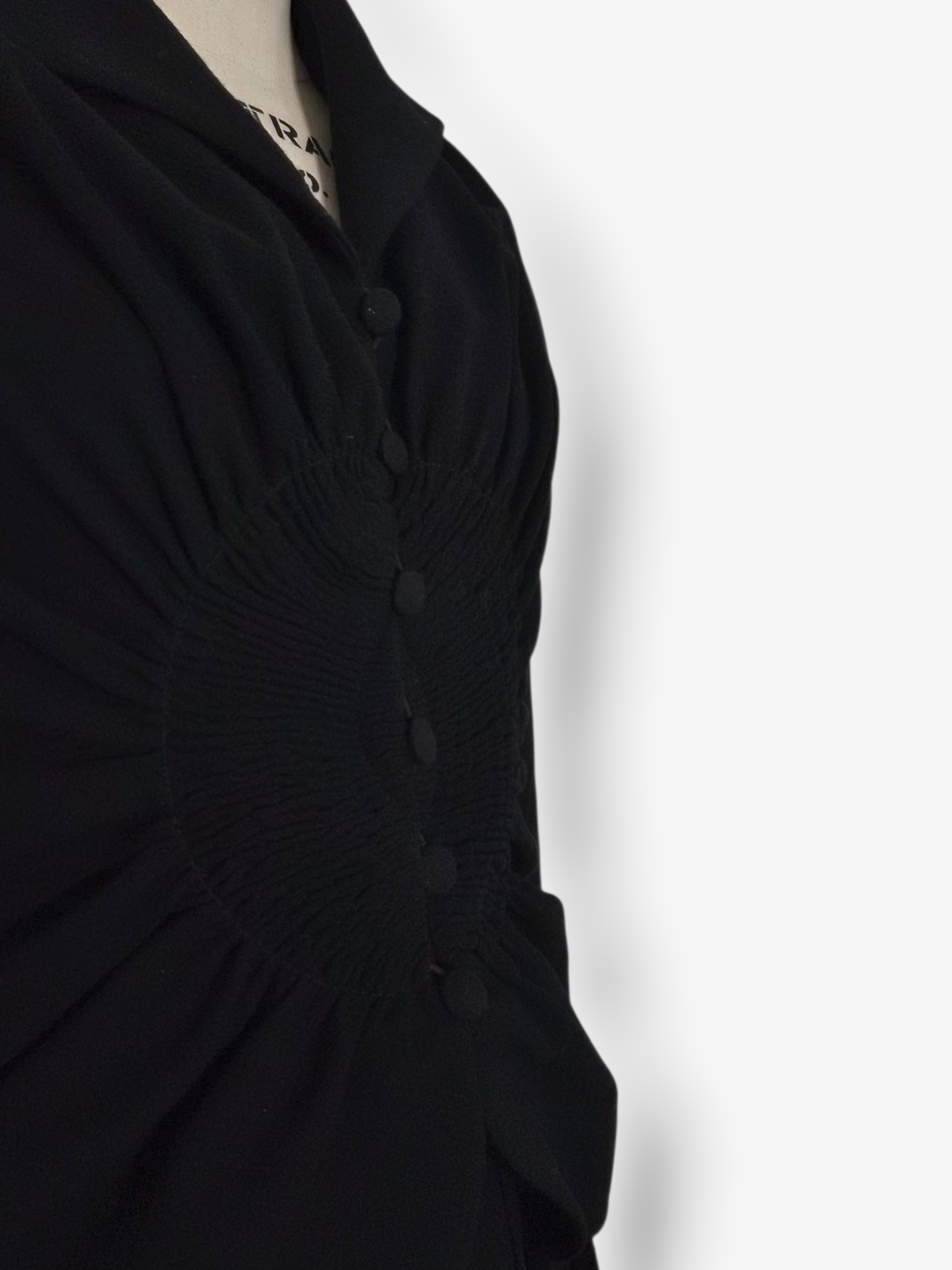 A rare and highly coveted piece from John Galliano’s Fall 1997 collection, crafted in a luxurious wool blend with an architectural cut that perfectly showcases his early design language. The shoulders are sculpted, the sleeves are long and slim, and the front features an extraordinary circular smocked detail created through masterful gathering that draws the waist inward and creates a striking silhouette. The piece closes with a row of Galliano’s signature fabric covered buttons and finishes with a soft, curved hemline that flows into a pleated skirt.