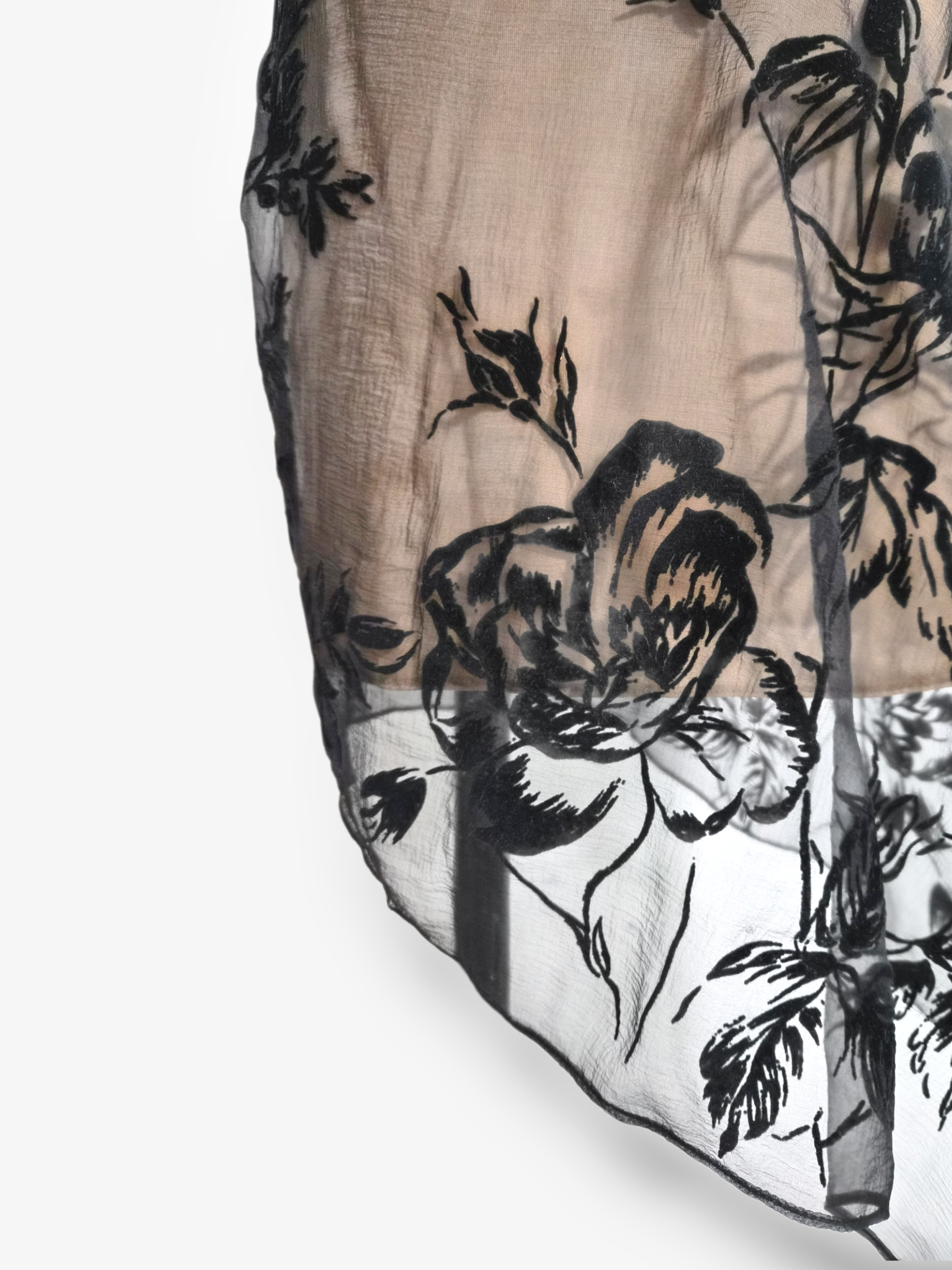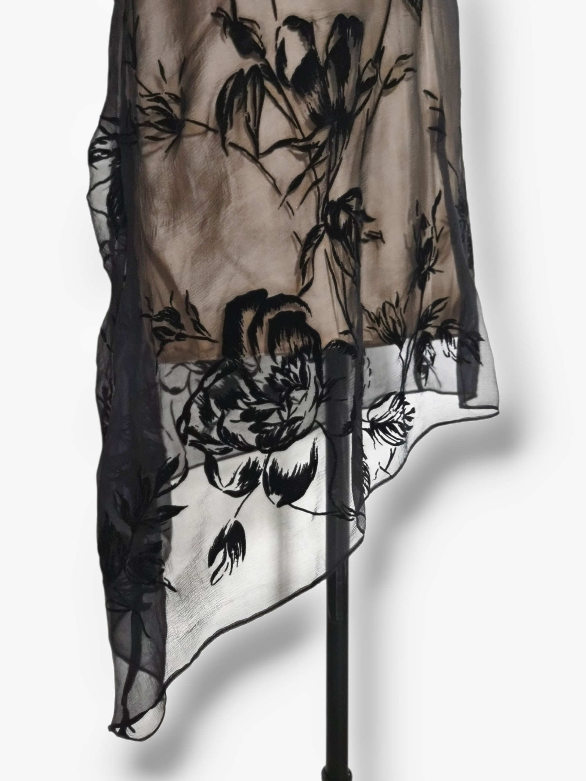 Exceptionally rare Lolita Lempicka Spring Summer 1998 slip dress, the same design that appeared on the runway in black and in red, worn by Laetitia Casta. This piece features a beautifully gathered, milkmaid-inspired neckline that naturally shapes and lifts the bust. The outer layer is a weightless sheer silk, covered in delicate velvet botanical motifs that create a soft shadow effect against the body. Underneath, a golden-nude silk lining adds warmth and highlights the velvet patterning. The skirt finishes in an asymmetric hem, giving the dress a fluid and romantic movement when worn