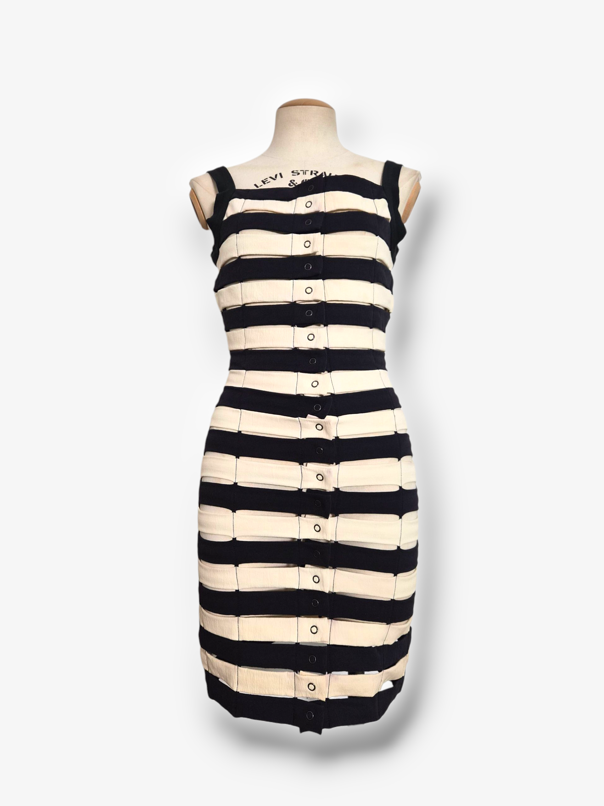 This 1990s Max Mara midi dress is a sculptural, body hugging piece created entirely from individual stretch panels that form bold horizontal stripes in black and cream. The construction is intricate and architectural, giving the dress its signature contouring effect while remaining comfortable and flexible. It closes at the front with a full row of snap buttons, allowing you to adjust styling and fit as desired.